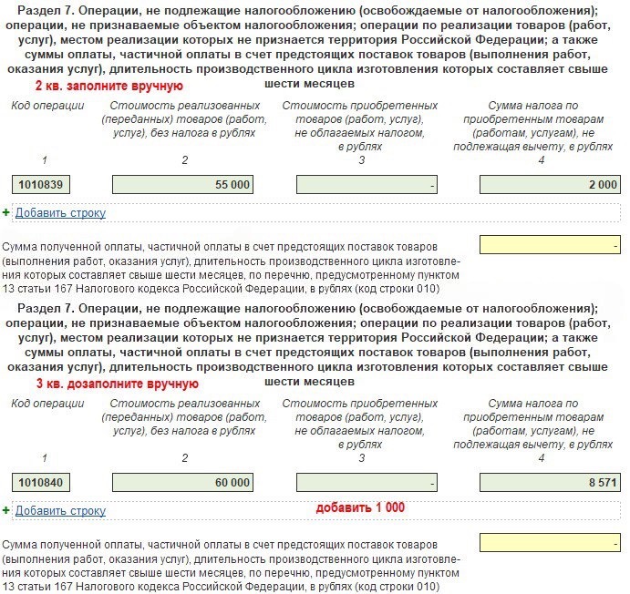 Рис. 12. Пример в 1С: заполненный раздел 7 с кодами