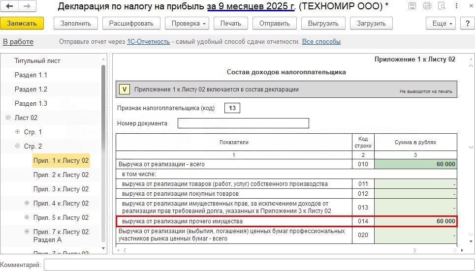 Рис. 13. Пример в 1С: декларация по налогу на прибыль