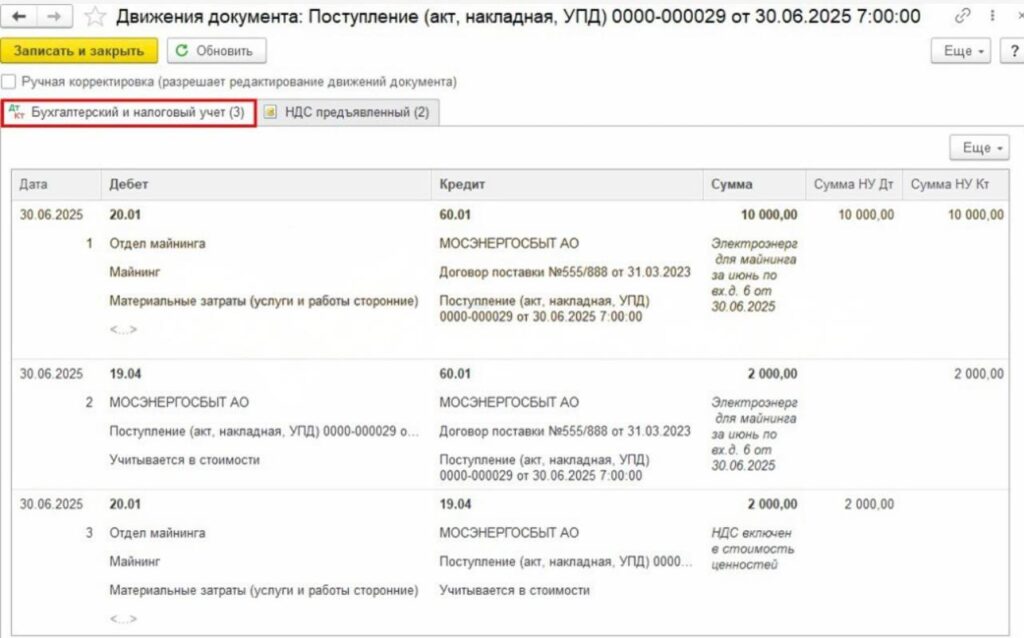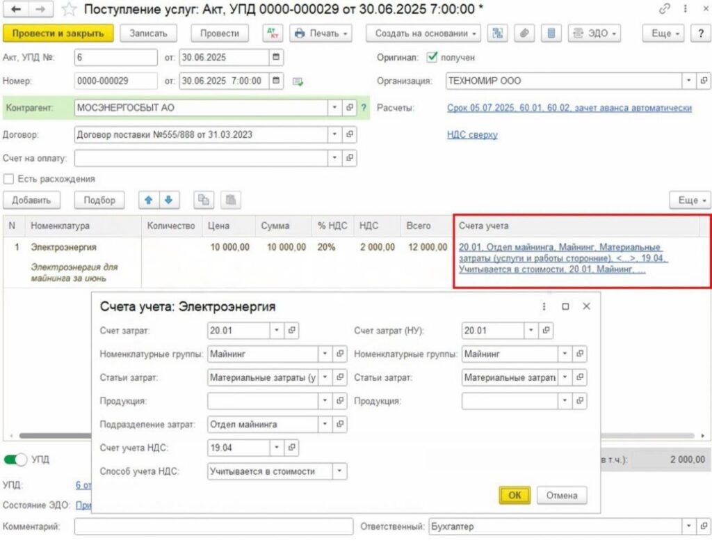 Если отражаете расходы на электричество или амортизацию, используйте ту же аналитику, что применялась при учёте производства криптовалюты.