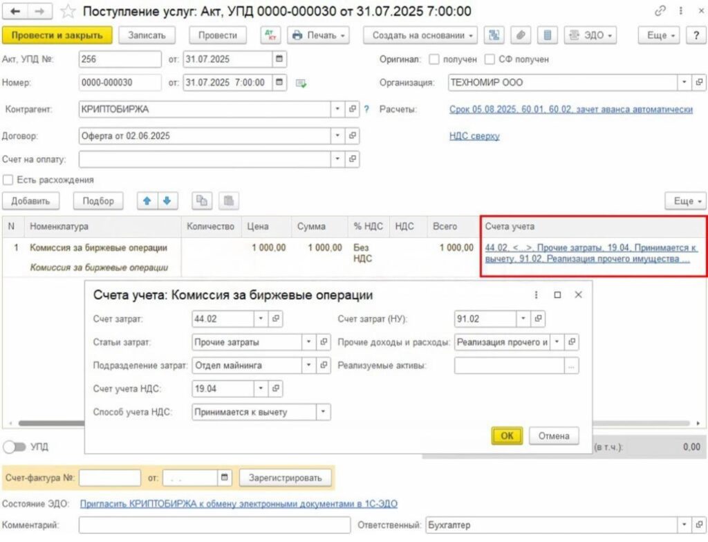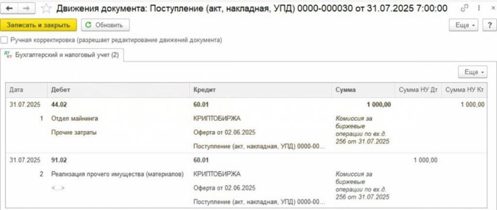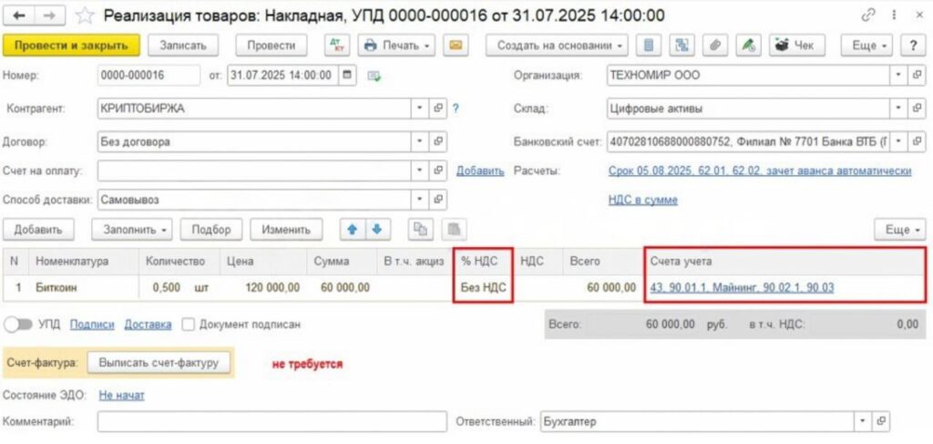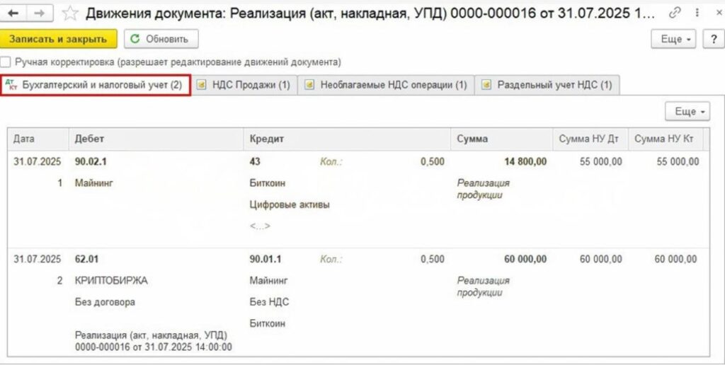 Рис. 7. Пример отражение сделки по реализации крипты в 1С (документ «Реализация товаров»)