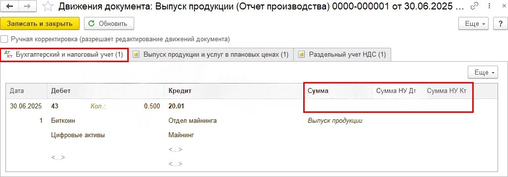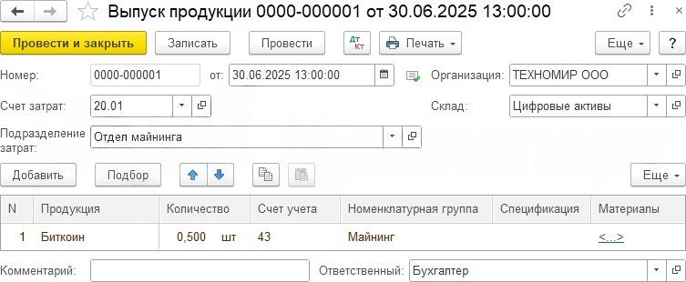 Проводка: В нашем случае выпуск криптовалюты по себестоимости отражается проводкой Дт 43 Кт 20.