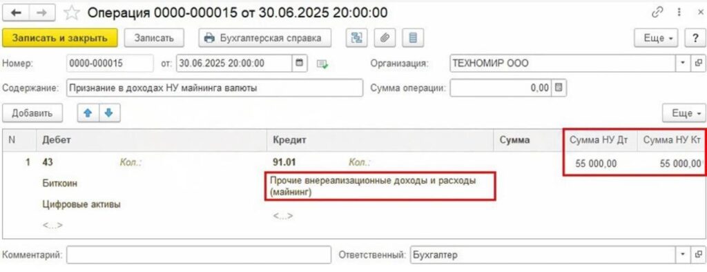 Проводка: Дт 43 Кт 91.01 – отражена рыночная цена добытой крипты.