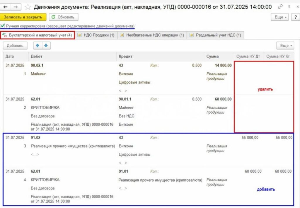 - Дт (дебет) 90.02.1 Кт (кредит) 43 – осуществлено списание затрат на реализованную крипту.